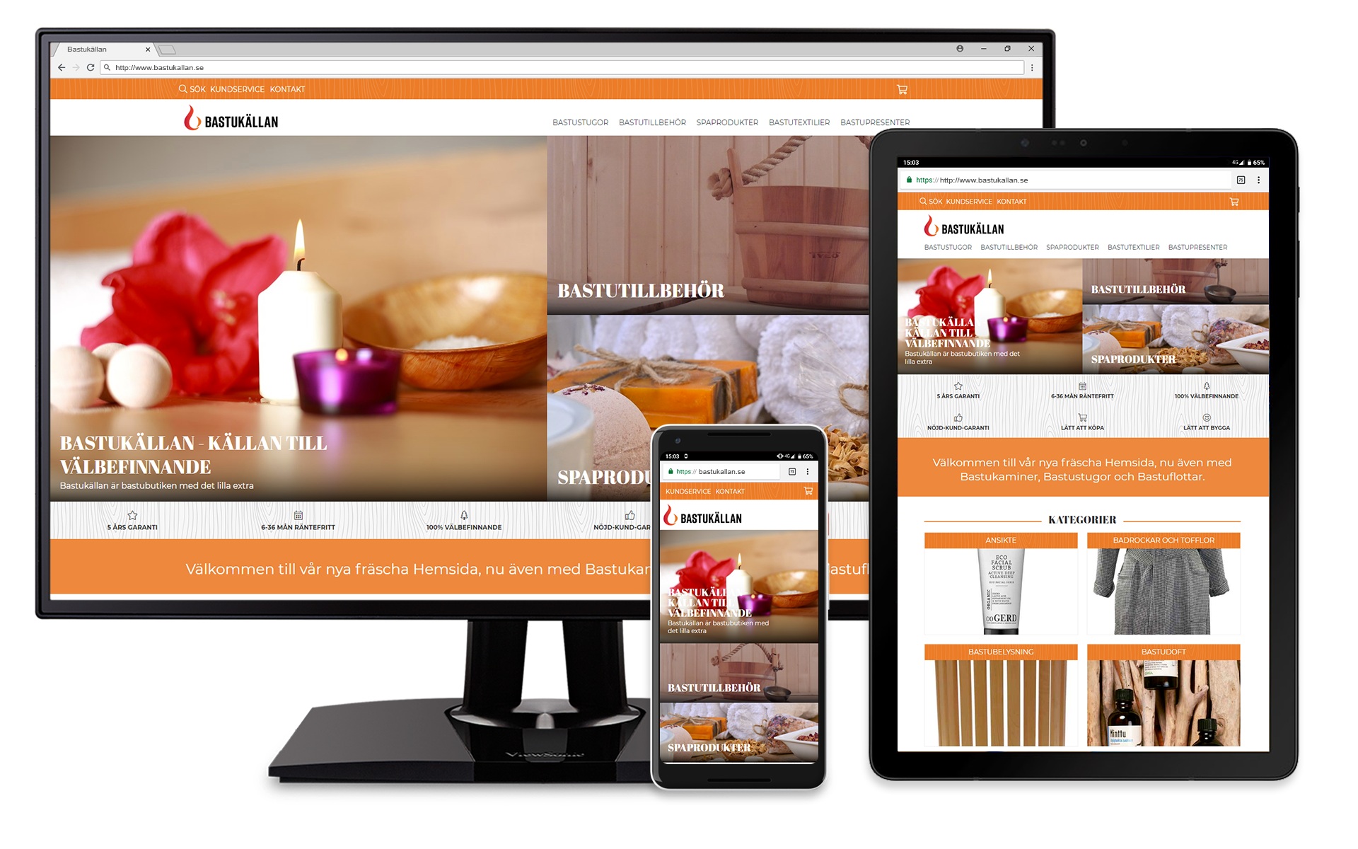 I webbshoppen kan du handla allt ifrån bastustugor och kaminer till spa-produkter och handdukar.