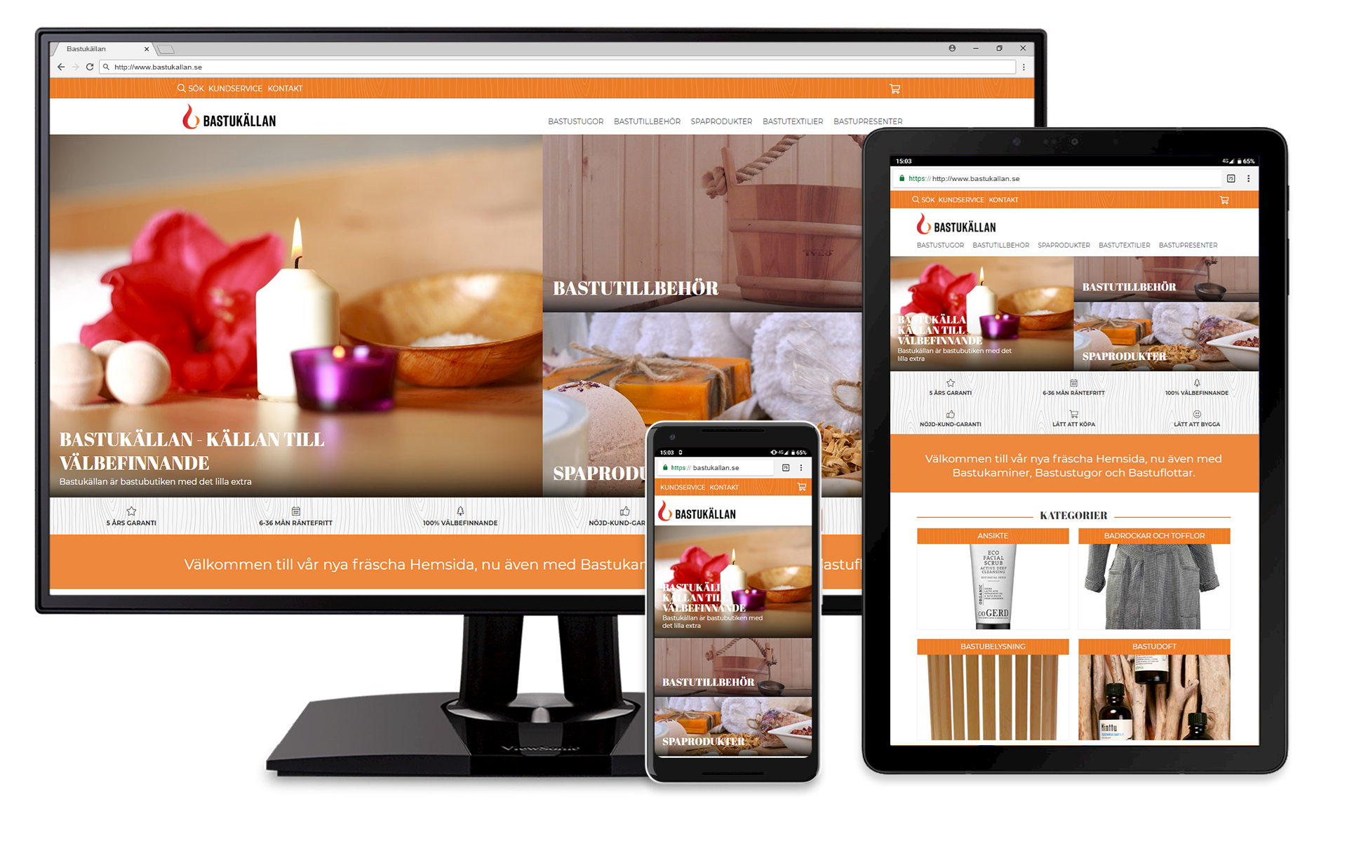 I webbshoppen kan du handla allt ifrån bastustugor och kaminer till spa-produkter och handdukar.