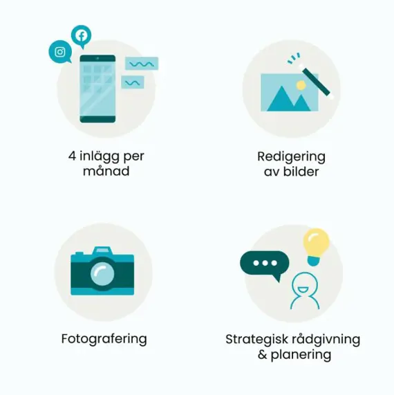 Med sociala medier light betalar kunden från 5 000 kr i månaden, och då ingår kontinuerliga uppdateringar i upp till två plattformar. Här ingår också fotografering och planering löpande. Upplägget passar särskilt företag som vill komma igång, arbeta mer professionellt med sina kanaler eller helt enkelt ta nästa steg.
